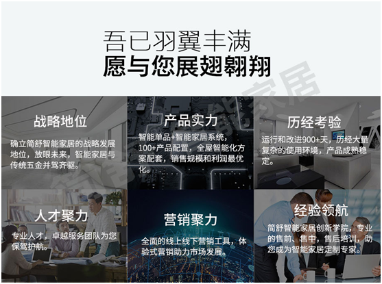 創新不輟就要百折不撓,追求卓越之路布滿艱辛,創新之路更是充滿風險,簡舒智能家居作為全屋智能家居行業的領導者,以高瞻遠矚的發展高見,大膽投入巨資組建國際性科技研發團隊,在創新的道路上一次次跌倒,又一次次站起,在學中干,干中學,掌握新知識、鍛造新技能、增長新本領,最終以國際先進技術為標準,自主研發生產全系列智能家居產品,涵蓋智能家居控制系統、智能門鎖系統、智能單品、智慧酒店管理系統、智慧辦公五大系統,支持LORA、NB-IOT、ZigBee、wifi等多種無線協議,提供智慧家庭、智慧酒店、私人影院、智慧辦公等一站式解決方案,共擁有50多項技術專利和30多項外觀專利,以及多個軟件著作權,取得了令人贊嘆的豐碩成果。