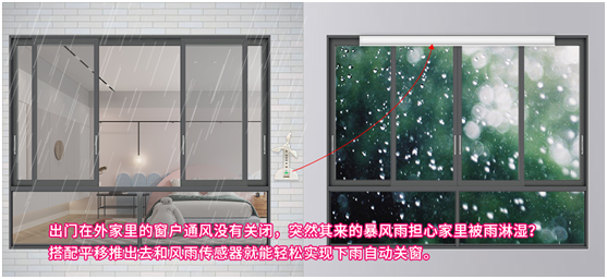 為了保證家中空氣流通,大家經常出門去上班了,也不會關閉家里的窗戶,但是突如其來的暴風雨會把家中的電器、沙發給淋壞,在辦公室的你只能干著急?你可以安裝簡舒智能窗戶搭配一個風雨傳感器就能輕松實現下雨自動關窗,每次下雨時,都會觸發風雨傳感器,風雨傳感器會把下雨信號傳達給智能窗戶,智能窗戶會立即自動關閉窗戶,家中有個智慧管家,是不是瞬間就讓你的工作變得更加安心,生活更加舒心?