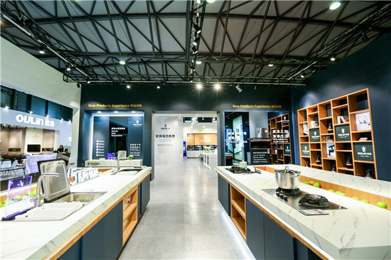 在全能家居展區(qū),我們通過材料的混搭,跨界的設計,推出歐琳T系健康廚房、衣柜、酒柜等高端廚衛(wèi)家居產(chǎn)品,打造了一個餐客廚一體化、衣臥一體化的“全能空間定制”系統(tǒng)。