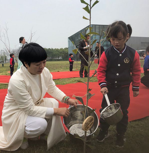 歐普照明創始人兼總裁馬秀慧(左)親手種下一棵樹苗。