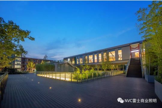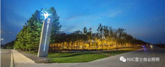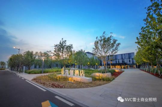 入夜的半晚,園區道路路燈和庭院燈照明,加上草坪燈、埋地燈點綴在園區景觀中,它們發出暖色的光,將雄安市民中心的夜晚裝點得美輪美奐。