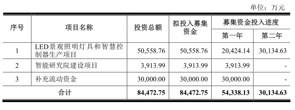 本次募集資金到位后,愛克萊特將按輕重緩急分別投入以下項目:LED景觀照明燈具和智慧控制器生產項目、智能研究院建設項目、補充流動資金,擬投入募集資金為84472.75萬元。