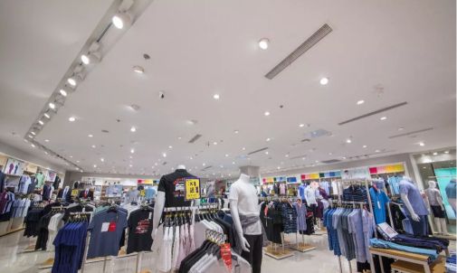 海瀾之家與紅豆的服飾陳列模式多種多樣,主要陳列模式有正掛,側掛,疊裝等,不同的陳列模式如果使有一種照明模式,將很難體現商品的特色。這時需要來自不同角度的燈光進行照明。在兩家專賣店燈光運用上,利用可調角度的射燈進行精準控光,將光投放在需要的地方,控制光照氛圍,以燈光的空間界定呈現出商品的節奏感,豐富視覺層次。