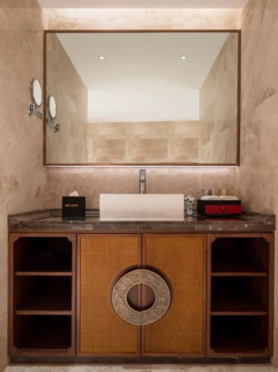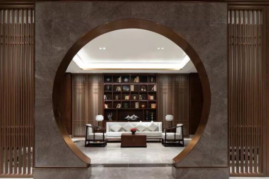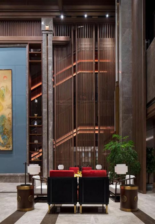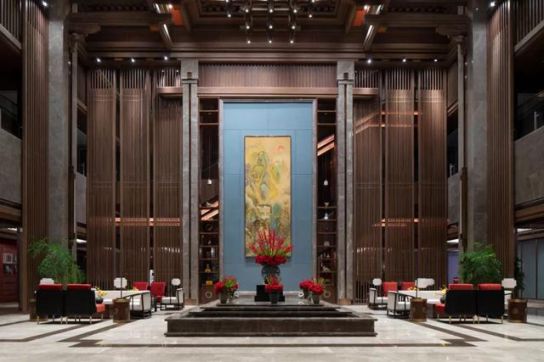 整個大堂以東方韻味的裝飾設計風格展現豐富的紅色文化傳承。前廳服務結構對稱分布,中軸盡頭將傳統照壁進行了改良,成為視覺中心點。室內陳設采用了明、清家具造型和款式特征,并且將中國尊、鼎、璽、韶樂、書法雕塑融入之中,為大堂空間增添了無限的藝術張力。