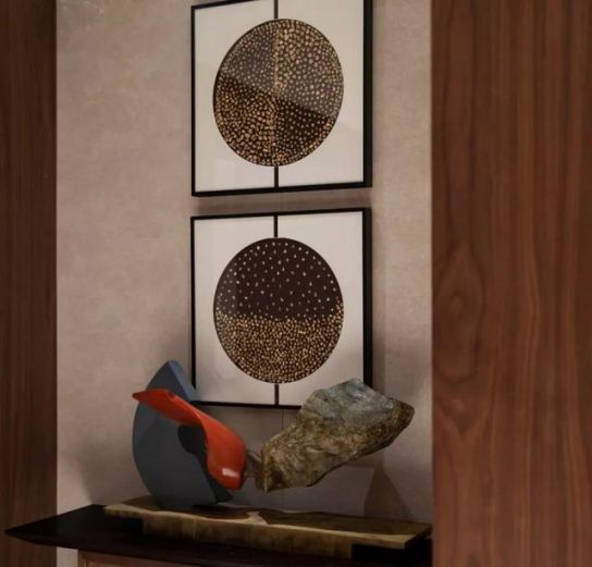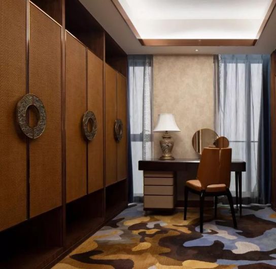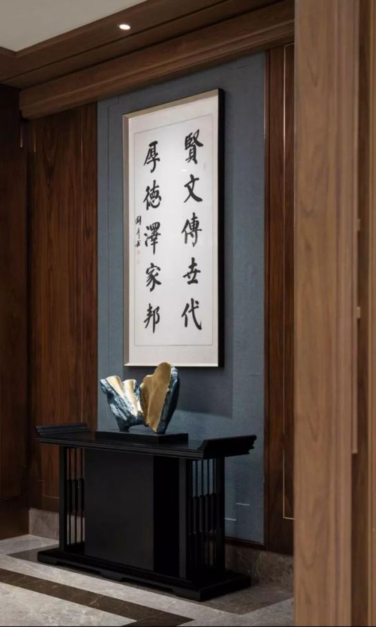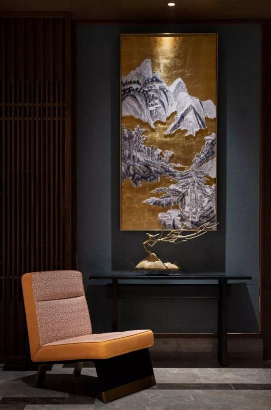 中式古典風格,室內陳設沿用了明、清家具造型和款式特征,與藝術家創作的水墨山水畫作,為房間增添了些許東方神韻,一些點到即止的小擺設柔和清雅,毫不喧賓奪主。為了不破壞這份舒適的靜謐,只用了少量的燈具“點”嵌在天花中,柔和的光暈將淺淡的天花、厚重的墻面微微洗亮,在大大降低了視覺眩光度的同時營造出溫潤、友善的氛圍。