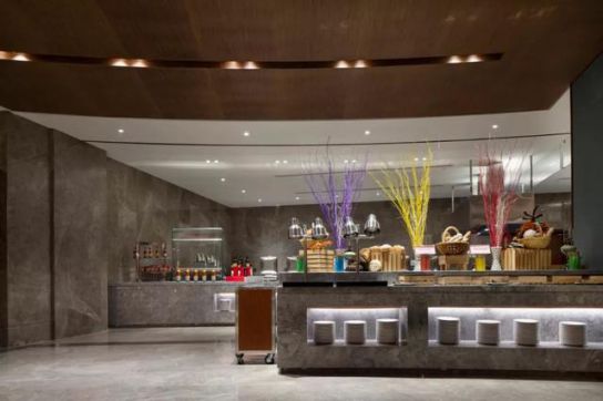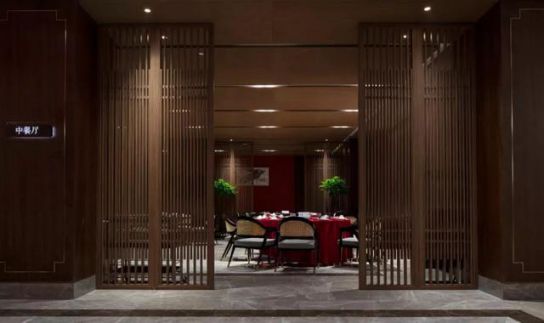 酒店一層設有能容納300人的全日餐廳,專職服務于各個時段來就餐的顧客。天花放射的這種頂面關系和中間紅色的文化元素,呈太陽神鳥羽翼環抱空間之態,體現出日出韶山的概念。