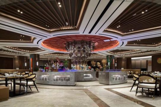 全日餐廳的氣氛正式、友好,它的一般照明的照度相比較于西餐廳要高出許多:照度均勻,少有亮度對比所帶來的情緒波動,點式光源,條狀光源與中間大型的花燈,均可以滿足良好的照明要求;