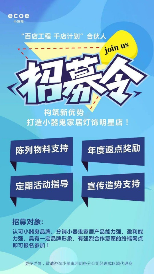 與“百店千店”項目有效搭配,打通線上線下,從產品層面來講,各終端門店產品上樣、展示將更豐富、更高端、更便捷;從銷售層面來看,品牌化展現,靈活新潮營銷工具助力,將為銷量提升創造更多契機!從渠道建設層面來說,或將成為小器鬼照明全面提升終端網點數量及質量的有效拐點!