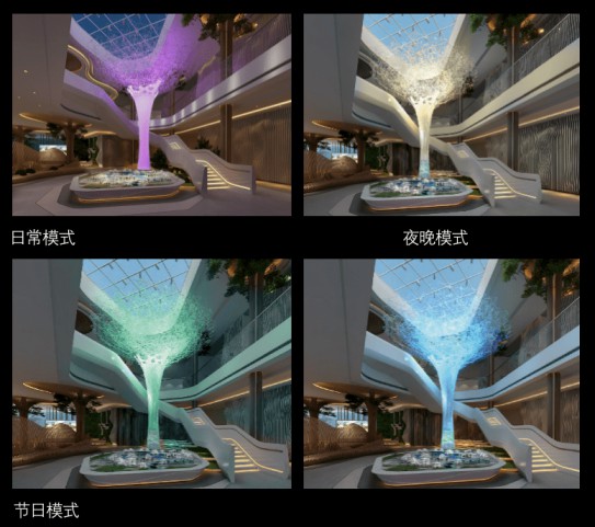 南京站嘉賓所提到的案例是建于明湖旁的康養(yǎng)小鎮(zhèn),如何才能通過燈光讓室內(nèi)設計重心打造的“現(xiàn)代化生命之巢”更具生命力? 通過三個模式呈現(xiàn)不一樣的光影效果,形成空間視覺中心和亮點,給人以震撼的感受,配合室內(nèi)聲效,打造漫步于室內(nèi)森林的奇幻觀感。最后通過投射RGB的光+內(nèi)透RBG的光+控制系統(tǒng),對“生命之巢”燈光的設想終得以實現(xiàn)。