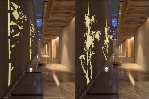 兩位嘉賓在探討之后得出應當結(jié)合當?shù)夭刈逦幕O計出自然、神秘、安靜的光環(huán)境的結(jié)論。 在該項目中,神龕經(jīng)過了一系列濃縮和抽離的設計,以一種更精簡的方式出現(xiàn)在接待臺的正后方。該神龕并沒有設計太多光去表現(xiàn),而是靠接待臺的光來映射的,經(jīng)過調(diào)節(jié)后,這一設計巧妙地產(chǎn)生了火焰效果,從而讓接待處出現(xiàn)了“佛光奇景”。