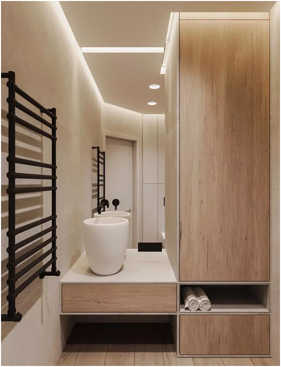 衛浴間,主調為“明亮柔和”。這個地方狹小,暗角比較多,以防水筒燈照亮大片面積,設有鏡前燈,在沐浴區也補充一下局部照明。