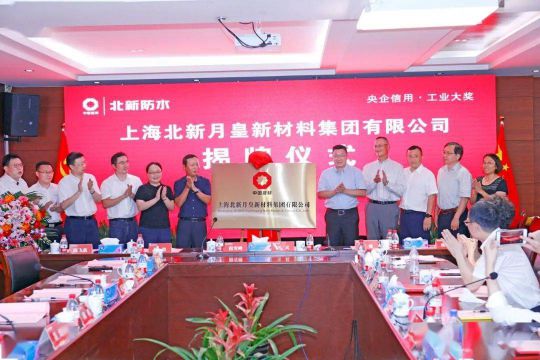 北新建材董事長(zhǎng)王兵、北新月皇董事長(zhǎng)程雪峰共同為“上海北新月皇新材料集團(tuán)有限公司”揭牌