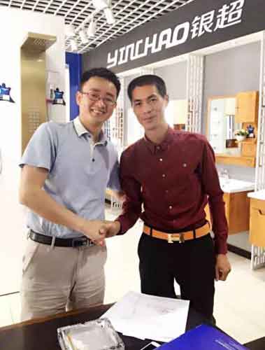 品尚衛(wèi)浴營(yíng)銷總監(jiān)蔡子業(yè)(右)與福建家家樂(lè)建材超市董事長(zhǎng)朱行(左)