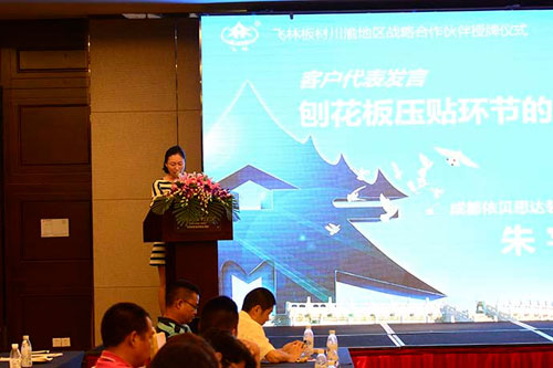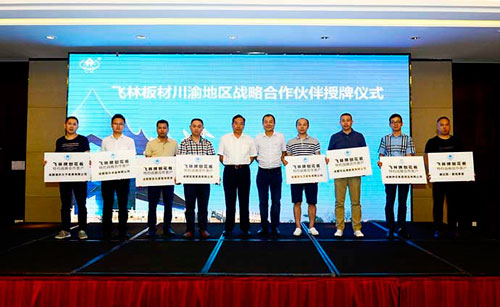 瑪格、新紅陽·新悅家居、伊戀、品潮、九天家私、宏鷹、愛舍元素、瑞升木業、港府太子、 美雅韻派、榮生、依貝思達、尚好家、欣森、國皓、美高、巨弘木業等共17家川渝知名家具、飾面板廠商代表出席儀式并接受授牌,正式成為飛林板材川渝地區戰略合作伙伴。飛林板材以強勢之態,進軍川渝市場,迅速布局西南。