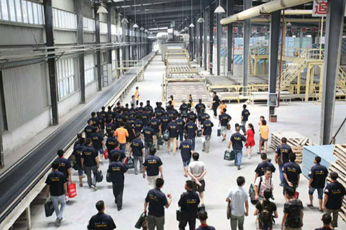 比賽間隙工長們參觀泰爾美建材的石膏板新工藝
