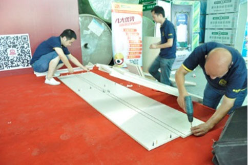 比賽現場泰爾美也向在場的各位工長們展示了其標尺定位石膏板和頂級快裝系統兩款新品。