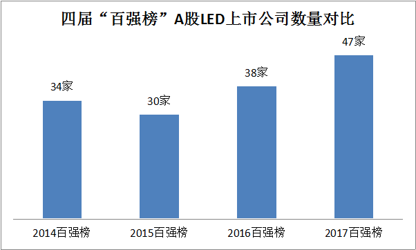 直至“2017百強榜”,A股LED照明上市公司上榜數量已接近榜單數量的一半。
