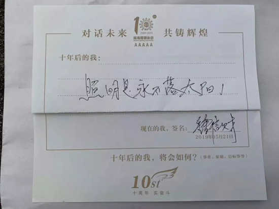 四天前,在南海照明協會十周年慶典上的“投遞未來信件”環(huán)節(jié),作為南海照明協會第一任會長,鐘信才在信紙上寫下了這么一句話。