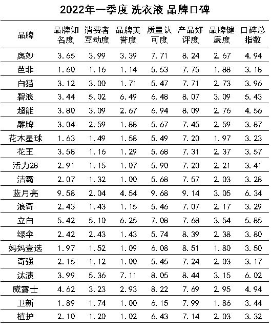 2022年6月2日,中國品牌口碑指數:2022年一季度洗衣液品牌口碑報告(以下簡稱《報告》)在京發布。