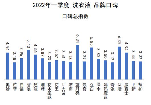 報告顯示,藍月亮、汰漬、立白在口碑總指數中位居前三。碧浪、威露士、奧妙、超能、白貓、雕牌、綠傘分列第四至第十位。