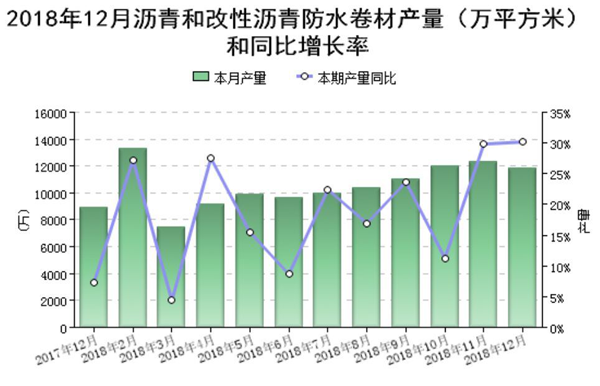 2018年12月,瀝青和改性瀝青防水卷材全國產量1.19億平方米,比去年同月增長30.16%。