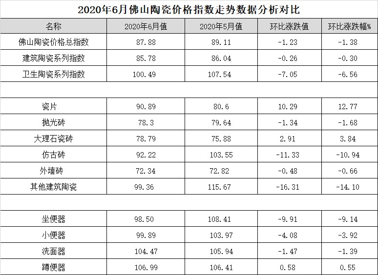 2020年6月份佛山陶瓷價格總指數(shù)報87.88點(5月報89.11點),環(huán)比跌幅1.38%,同比跌幅1.15%。建筑陶瓷系列指數(shù)報85.78點(5月報86.04點),環(huán)比跌幅0.30%,同比漲幅0.64%;衛(wèi)生陶瓷系列指數(shù)報100. 49點(5月報107.54點),環(huán)比跌幅6.56%,同比跌幅9.49%。6月份,佛山陶瓷價格指數(shù)呈跌勢,多數(shù)代表品指數(shù)走跌,市場行情穩(wěn)中向下。