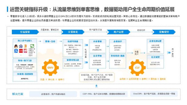 報(bào)告最后指出,受流量紅利退卻、獲客成本增加等因素影響,以規(guī)模化獲客并實(shí)現(xiàn)銷售轉(zhuǎn)化、從而帶動(dòng)GMV增長(zhǎng)的傳統(tǒng)營銷模式變得更加困難,因此零售企業(yè)的“運(yùn)營關(guān)鍵指標(biāo)”也在發(fā)生變化,由流量思維轉(zhuǎn)型到單客思維,數(shù)據(jù)驅(qū)動(dòng)用戶全生命周期價(jià)值延展,即專注每一位既有用戶的生命周期價(jià)值(CLV)。2.0階段,零售企業(yè)更加關(guān)注會(huì)員數(shù)、會(huì)員活躍度、客單價(jià)、復(fù)購率、裂變率等核心指標(biāo)。