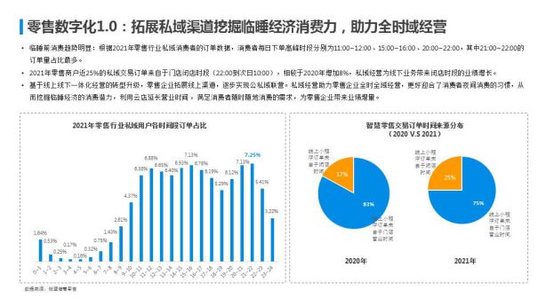 基于此,《報(bào)告》指出,通過私域渠道拓展業(yè)績(jī)?cè)隽渴橇闶蹟?shù)字化1.0時(shí)代的私域的主要價(jià)值。根據(jù)《報(bào)告》數(shù)據(jù),2021年零售行業(yè)私域用戶各時(shí)間段訂單占比數(shù)據(jù)顯示,近25%的私域交易訂單來自于門店閉店時(shí)段(22:00到次日10:00),該數(shù)相較于2020年提升8個(gè)百分點(diǎn)。