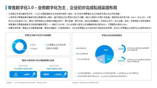 值得一提的是,此次《報(bào)告》對(duì)零售數(shù)字化發(fā)展階段做出了清晰界定。報(bào)告指出,零售數(shù)字化1.0時(shí)代即零售企業(yè)實(shí)施全渠道基建階段,其主要特征為持續(xù)性投入支撐數(shù)字化業(yè)務(wù)的基礎(chǔ)建設(shè),拓展私域場(chǎng)景的零售企業(yè)獲得業(yè)績(jī)?cè)鲩L(zhǎng)以及零售企業(yè)實(shí)施全渠道基建,推動(dòng)業(yè)務(wù)數(shù)字化。這意味著,零售數(shù)字化1.0階段,零售企業(yè)數(shù)字化主要完成從實(shí)體商業(yè)向數(shù)字商業(yè)轉(zhuǎn)型升級(jí),通過構(gòu)建線上智慧商城為線下實(shí)體門店創(chuàng)造全時(shí)全域一體化經(jīng)營渠道,通過品牌商城的打造幫助零售企業(yè)傳遞品牌價(jià)值、構(gòu)建更多連接消費(fèi)者的觸點(diǎn)、完善和積累數(shù)字化資產(chǎn)。